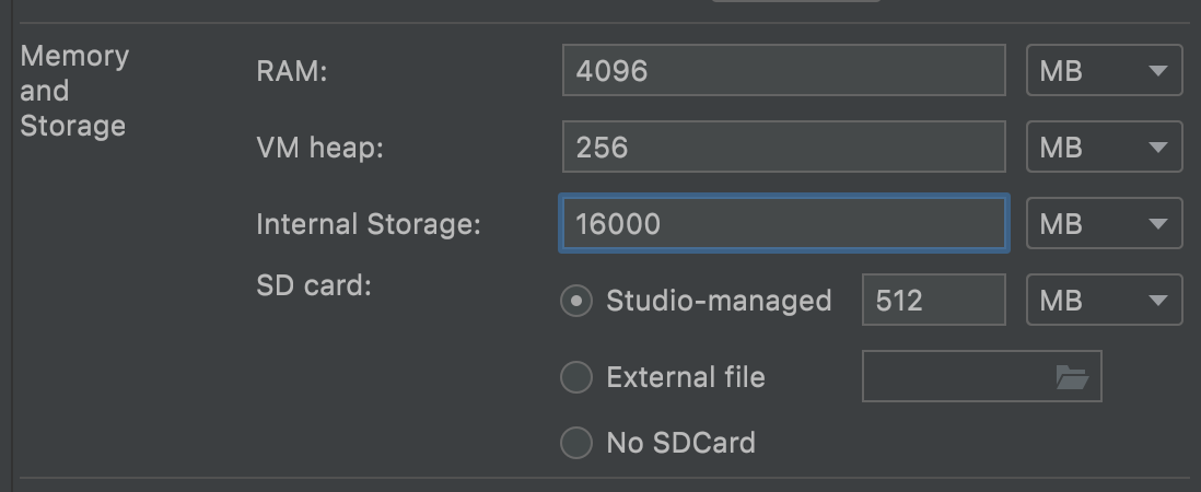 次に仮想マシンの設定をします。ゲームが動作するためには少なくとも4GBのメモリが必要なので、RAMのところは4096MB以上の値を入力します。Internal Storageは10GB以上を指定します。